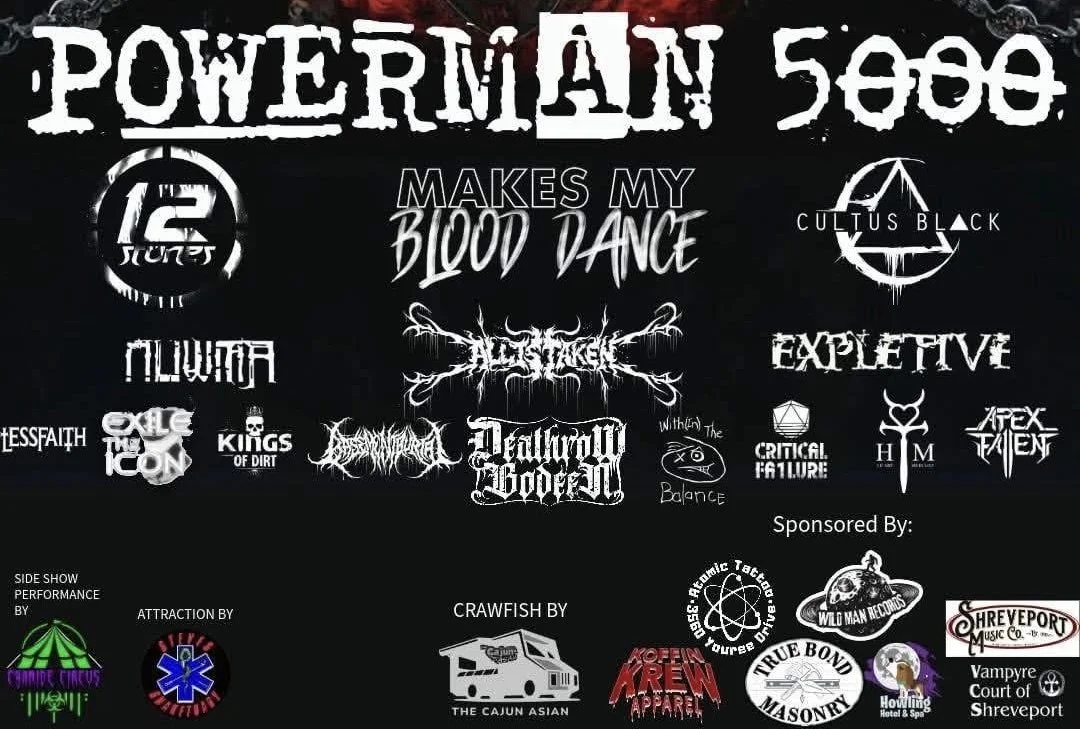 All day long from 10am-12am we have 16 bands playing playing throughout the day and night. Several local,and regional acts like local Shreveport favorites Nuwma, Within The Balance,Embrace The Filth, Kings of Dirt, Less Faith and Whether. Local legendary acts like Expletive and Critical Failure.